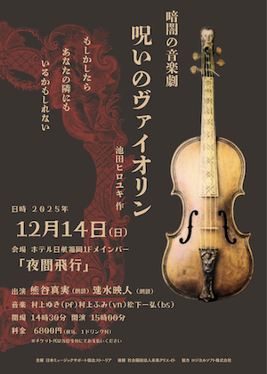 ホテル日航福岡1Fメインバー 「夜間飛行」で行われる 暗闇の音楽会「呪いのヴァイオリン」 私は劇中の楽曲を担当させていただきました。 当日は生演奏でお送りします。 日時 2025年12月14日 会場 ホテル日航福岡1Fメインバー「夜間飛行」
