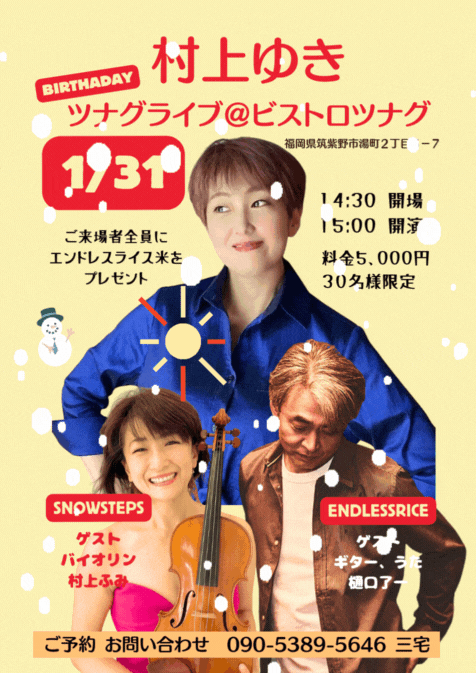 昨秋 東京から福岡に移住してきた村上ゆきがお贈りする「ツナグライブ」 以前ピアニスト三宅美紀子さんのラジオ番組にゲスト出演させていただいた折りに 「いつかビストロツナグでライブやりたいです」と言っていたことが実現します。 またバースデイ記念